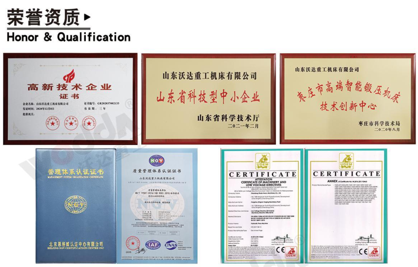 山东沃达重工在工艺质量、制造环节中,严格参照国家及行业标准。在非标类产品制造中亦是优于国家和行业标准设计,严控每一个环节,确保每一处质量。公司系列产品通过了“ISO9001国际质量管理体系认证”、“欧盟 CE 认证”,并积极参与质量管理绩效评价、参与液压机行业国家标准制定等。
