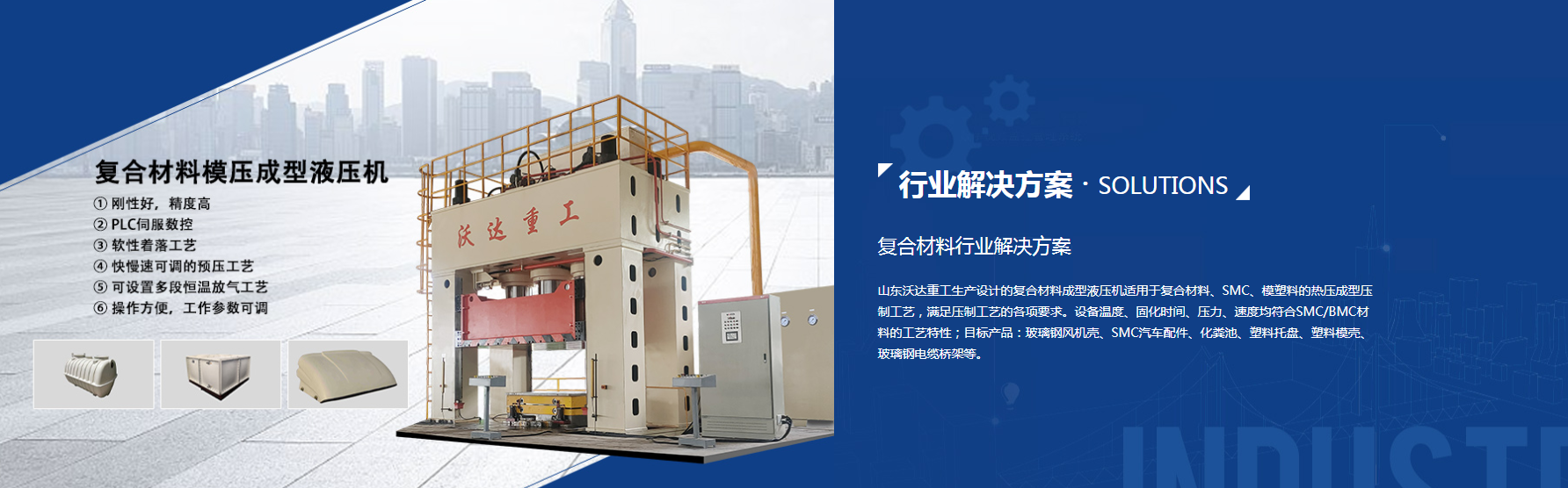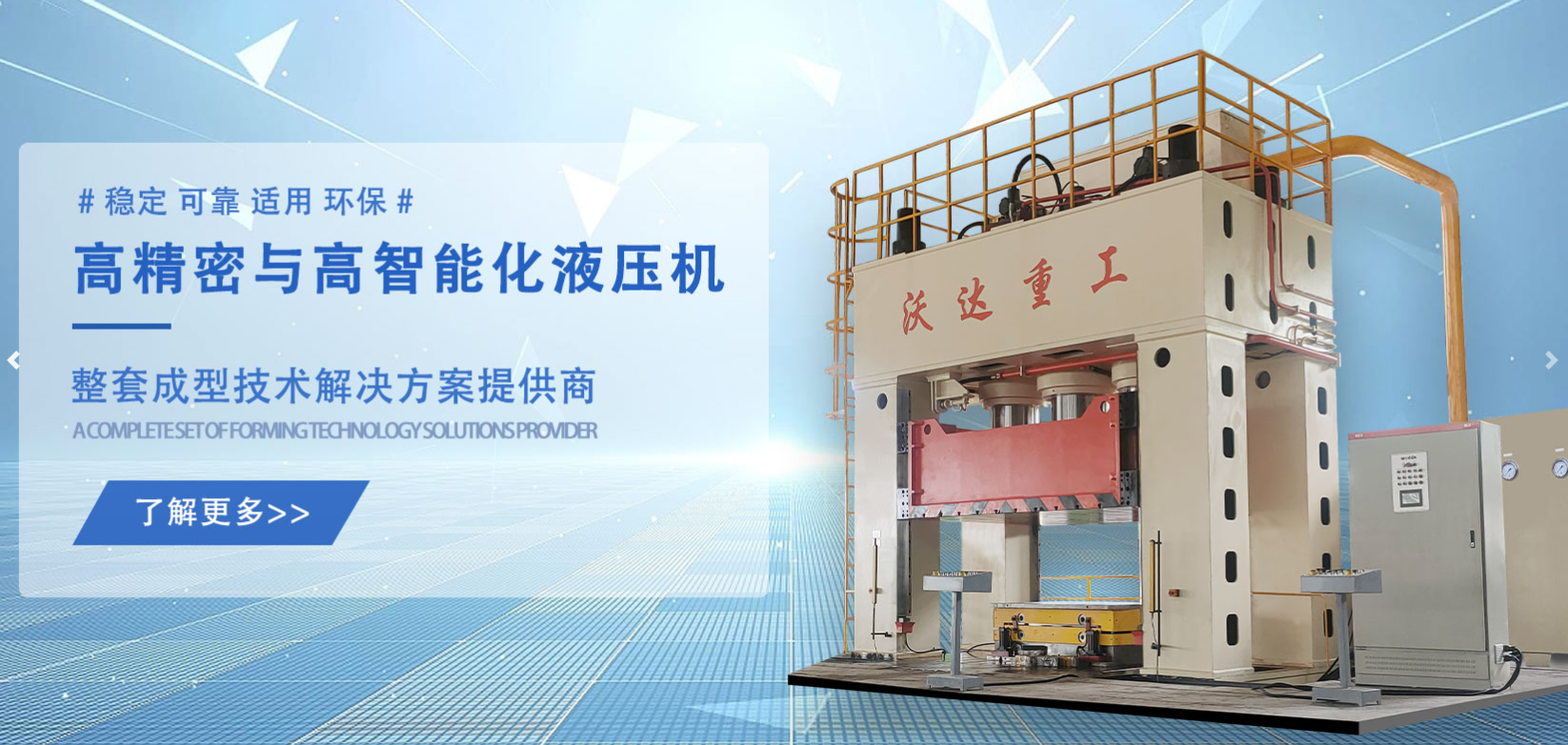 山东沃达重工的液压机系列产品在复合材料成型、冲压拉伸、粉末成型等行业拥有先进成熟技术,致力于研发制造高精密与高智能化液压机及提供整套成型技术解决方案。公司主要产品有四柱液压机、单柱液压机、龙门液压机、框架式液压机、粉末成型液压机、金属拉伸液压机、玻璃钢模压液压机、复合材料成型液压机、锻造液压机、冲床、压装校直机及各种配套模具(冲裁、拉伸、模压、锻造)等。产品主要有外形大方美观、操作简单、节能高效、安全环保、稳定智能等特点。产品广泛应用于汽车制造、钣金加工、畜牧养殖、采矿、冶金、环保、交通、发电等行业。