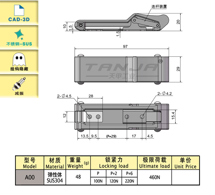 内扣式弹性搭扣,内扣式挂钩,结构紧凑,节约安装空间, 可用于周转箱/发动机罩
